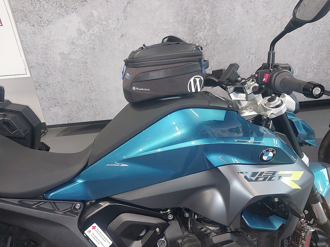 The tank bag is the Click bag system from Wunderlich - you can chose between the 6l volume ( shown at the foto at this page ) or a 3l volume one.